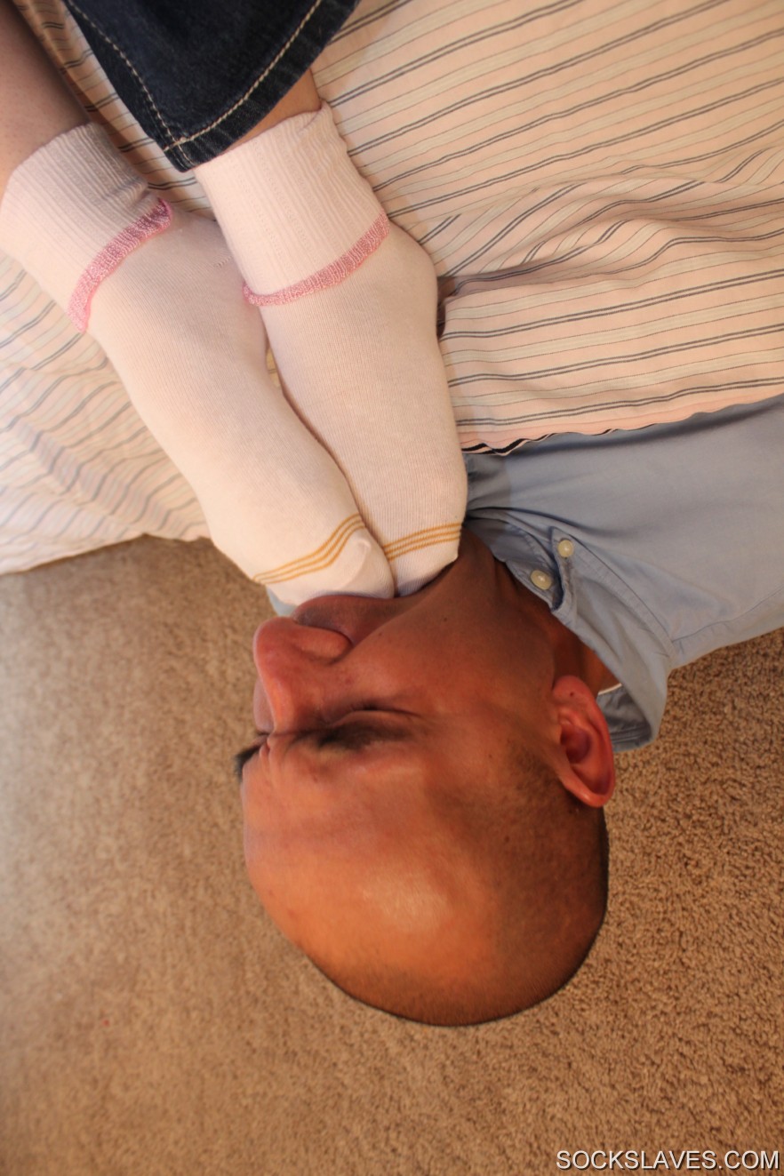 Mistress Megan warms her feet smothering her socked feet on the face of her slave lying under her bed