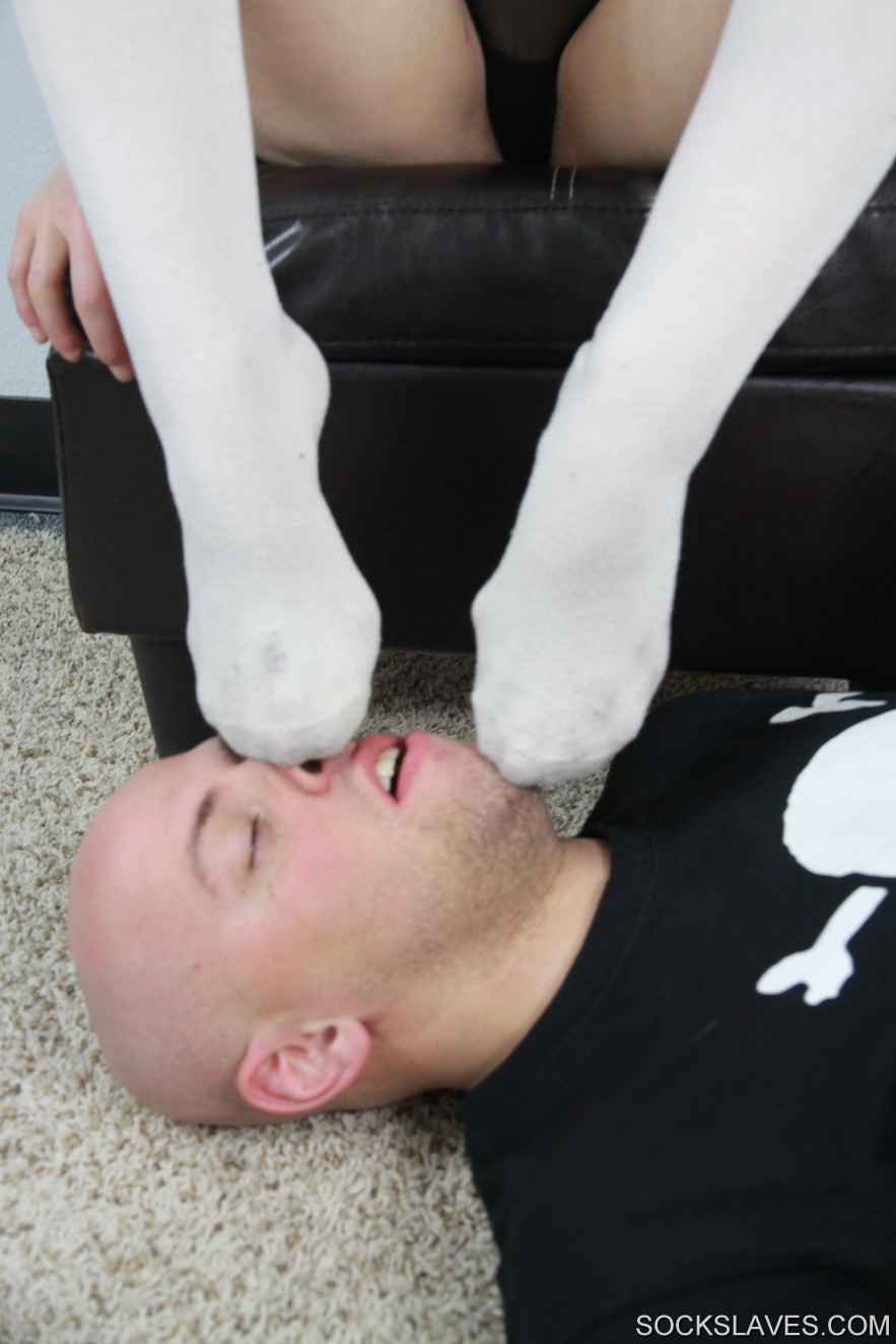 Mistress Nikki smothers her smelly white socks on the face of her slave beneath her feet